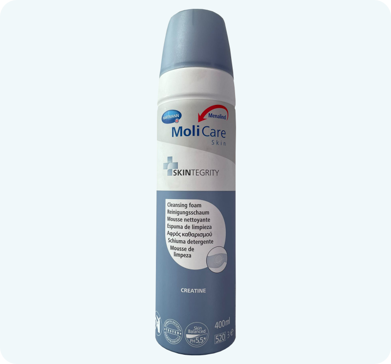 Espuma limpiadora para la limpieza rápida y suave de la piel en personas que sufren incontinencia. Producto especialmente indicado para pacientes incontinentes.
